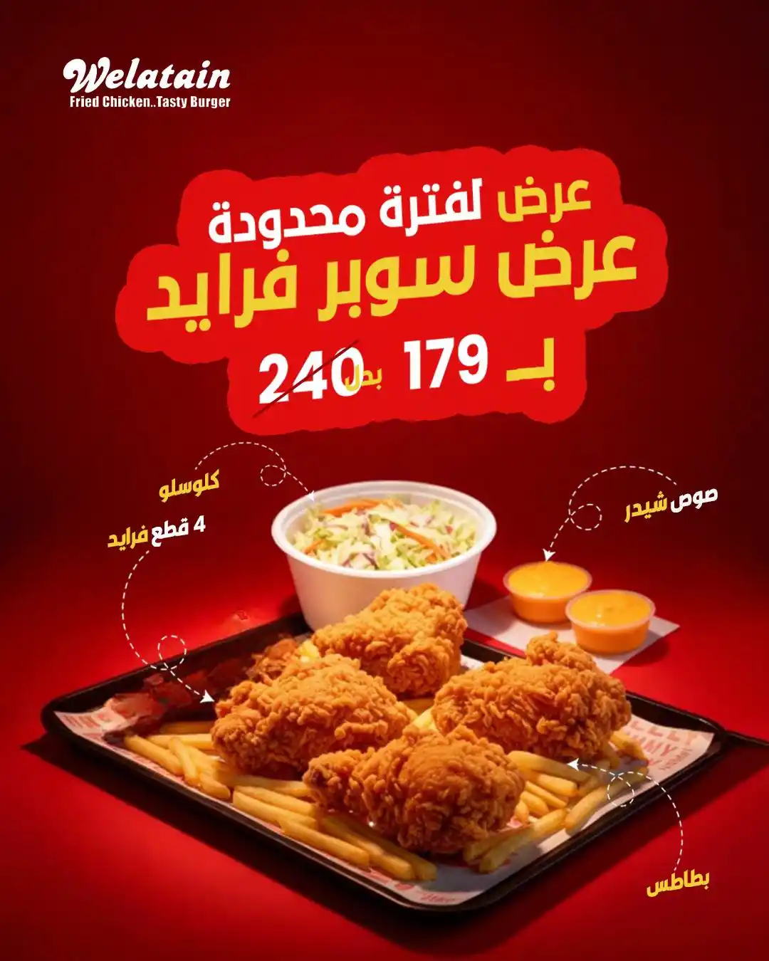 4 قطع فرايد + بطاطس + كولسلو + صوص شيدر